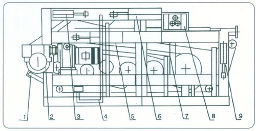 其中:1、刮泥系統(tǒng);2、傳動系統(tǒng);3、上糾偏系統(tǒng);4、沖洗系統(tǒng);5、下張緊系統(tǒng);6、上張緊系統(tǒng);7、急??刂?;8、氣控箱;