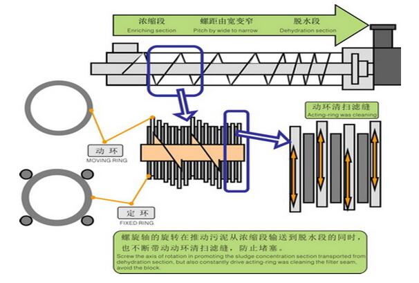 3、自清洗:螺旋軸的旋轉(zhuǎn),推動(dòng)游動(dòng)環(huán)不斷轉(zhuǎn)動(dòng),設(shè)備依靠固定環(huán)和游動(dòng)環(huán)之間的移動(dòng)實(shí)現(xiàn)連續(xù)的自清洗過(guò)程,從而巧妙地避免了傳統(tǒng)脫水機(jī)普遍存在的堵塞問(wèn)題。