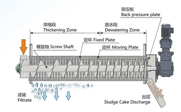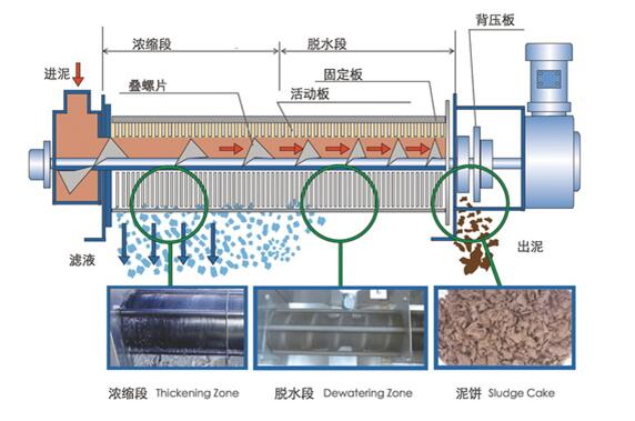 2、脫水:經(jīng)過(guò)濃縮的污泥隨著螺旋軸的轉(zhuǎn)動(dòng)不斷往前移動(dòng);沿泥餅出口方向,螺旋軸的螺距逐漸變小,環(huán)與環(huán)之間的間隙也逐漸變小,螺旋腔的體積不斷收縮;在出口處背壓板的作用下,內(nèi)壓逐漸增強(qiáng),在螺旋推動(dòng)軸依次連續(xù)運(yùn)轉(zhuǎn)推動(dòng)下,污泥中的水分受擠壓排出,濾餅含固量不斷升高,最終實(shí)現(xiàn)污泥的連續(xù)脫水。